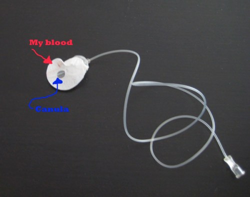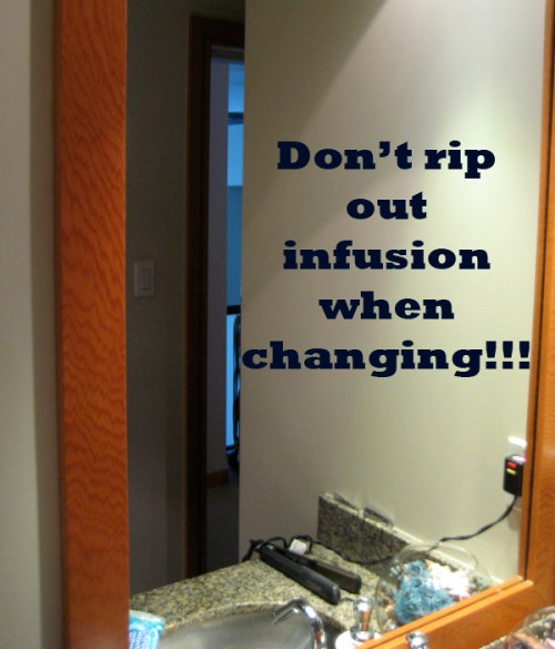 But not even two hours later, as I was looping my thumbs into the waistband of my pants and pulling them down, to change into my cycling clothes, I pulled the infusion right out of the skin – OUCH!