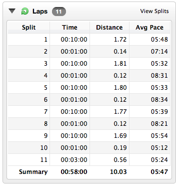 - 7 a.m. BG before: 10.2 (Gu energy gel, no bolus (wouldn’t normally take one of these for a 10k, but my blood sugars dropped two points in a matter of 20 minutes, so just to be on the safe side I took one) –> -50% temporary basal rate