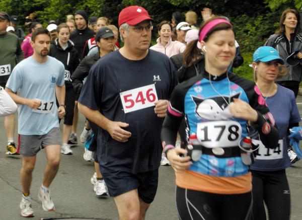 I looked at my Garmin. Holy Crap! I was doing a 5:15 – where the heck was that coming from? My Garmin started beeping at me, telling me that my first 10 minutes was up, it was time to walk a minute. So I started walking, but people were passing me, I couldn’t let them pass me, so after about 30 seconds I started running again, which caused me to instantly berate myself for not running my race. I am a firm believer that the 10:1 system is a kick-ass racing strategy, that leaves you with much-needed energy at the end of the race, and doesn’t really cut into your time at all. I promised myself to do better the next go around. And It didn’t take long for me to reel in an older fellow, who had passed me on the walk break, and was going at a nice clip – he became the mouse, while I was the cute little kitty, ready to pounce! Every walk break, he would surge ahead, but once I started running again, I always managed to catch up, and I even passed him a couple of times. By about the 8k marking, though, my energy was starting to wane. Oh crap. The loud, pounding feet of the guy behind me became irritating, the rabid swinging arms of the woman ahead of me was driving me insane, and the unleashed dogs jetting out in front of us racers was just flat out pissing me off. But then, at the side of the path, just a little ways ahead, a woman volunteer was jumping up and down, high fiving the racers, urging them on, shouting at them to keep going, “It’s for the kids!” she yelled.