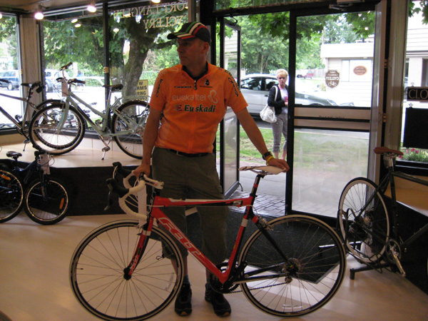 Finally, the bike shop: Fort Langley Cyclery. Mario had already rode by it on his way into the Fort, and was drooling over the bike they had displayed in the window: A Felt F5 in blood orange – he likes orange! Hmmm … could it be … could we soon be a Family of Felts???