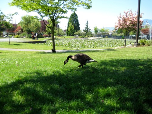 I made a new friend in the park today, an unlikely friend. No, not one of the rubbies that likes to frequent the park all day and all night, but a Canada goose. A real Canada goose.