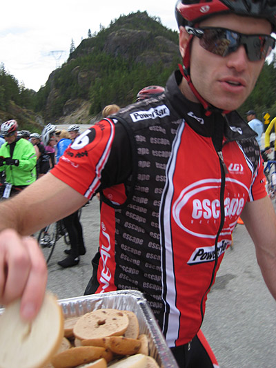 The recreational riders, the ones who actually needed wanted an energy boost, or a refreshing splash of H20, or a refill of potassium, or some bagel bread to soak up the nausea started coming through around 10 a.m. I liked them! I’d say probably 90 per cent of the cyclists were amazing, so thankful, so appreciative, so complimentary. One guy even said I was the prettiest girl he’d seen all day … I think all he wanted were my bagels 😉
