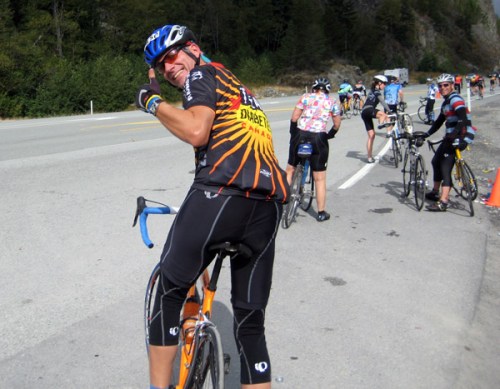 Mario came through the station just before 11, and my goodness it was so great to see him. He had the biggest smile on his face, and he was so energized, telling me all about how great his legs felt climbing the killer hills, passing other riders, and how he sampled wine at the feed station (hmm … was it really wise for the event organizers to offer up wine half way through a cycling event?)