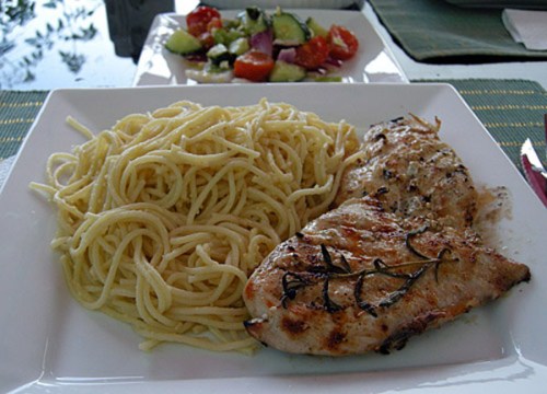 • 1c. angel-hair pasta with olive oil drizzled on top and a smattering of parmesan cheese (44 grams carbs)