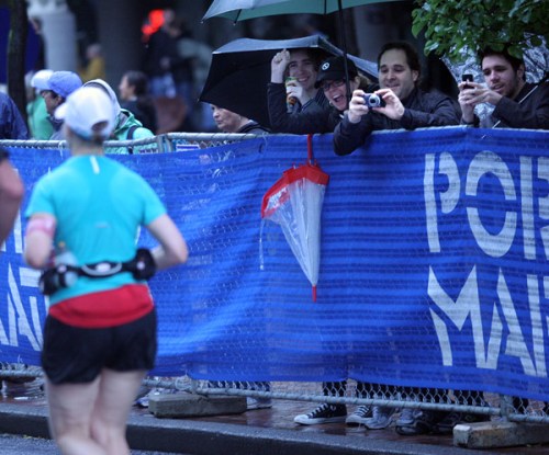 It was early, not yet even 6:30. The small, three-by-three, blue port-a-potty was nearly pitch black on the inside. Bib #6764 could see a flash of light seeping through the crack that linked her port-a-potty with the port-a-potty next door. She swiveled her head around to see if there was a light switch, but couldn’t see one. Dammit, she thought, why didn’t she bring her headlight? As she pulled her shorts up, careful not to touch a thing around her, the advertisement for Method anti-bacterial, all-natural cleaner, posted to the inside door, seemed to mock her. And yet, aside from being one of the dirtiest places on earth, the port-a-potty felt almost like a safe haven for her, saving her from the cold rain pounding down outside, and from the hordes of excited and nervous people filling up the 4:15 corral. She could stay there all day, she thought, surely no one would notice. Her family and friends waiting on the sidelines to cheer her on would just think she gave up, maybe stopped in at one of the many Portland pubs for an authentic Pacific Northwest beer, and would head back to the hotel and wait for her there, yep, that’s exactly what they would do, she thought.