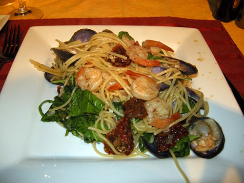 AND I made him dinner! Shocking, I know. I don’t much cook, can’t stand it really. I’ve made dinner for Mario a total of three times in the five and a half years we’ve been together. He seems to like my meals, though, because he requested an at-home birthday meal again this year. So, in keeping with the cycling theme, I made him a pre-race fuel dinner: Spaghetti with pinot grigio and seafood, courtesy of Giada De Laurentiis. AND I didn’t poison us … Mario actually went back for three helpings! (Don’t get any ideas, this is not going to become a regular occurrence.) I also made fresh-baked bread, but given that it was my first time doing so, I didn’t exactly time it correctly; it didn’t come out of the oven until two hours after we ate!