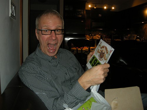 I made him a race bib! And apparently I did such good job of it, he thought it was the real deal. Thank you Photoshop. I also put together a swag bag, complete with a water bottle, cycling magazines, an over-sized shirt, a cherry-flavoured Larabar, a sample-size chamois butter and coupons just like you’d get when picking up a real race bib!
