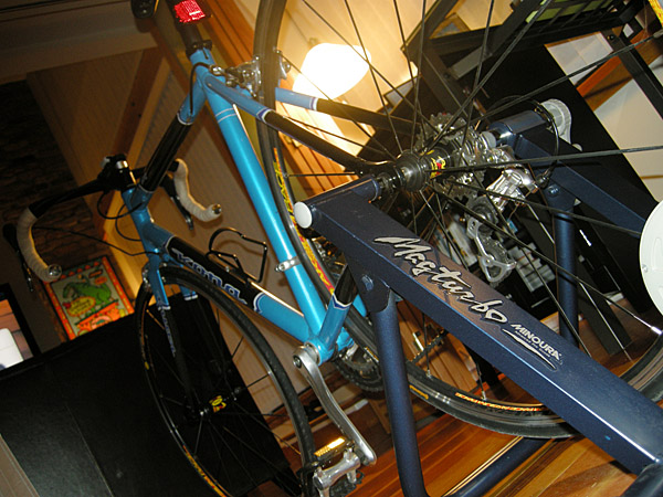 When the work was all done for the day, I put my bike shorts on and plopped myself down on the trainer and started pedaling. It was my first go on the trainer and I was little concerned as to how I would take to it. Mario wasn’t kidding, it was horrendously mind-numbing. He guessed I’d last 20 minutes, I was ready to get off at 10. But, I persevered … if only to finish the episode of How I Met Your Mother that I’d started.