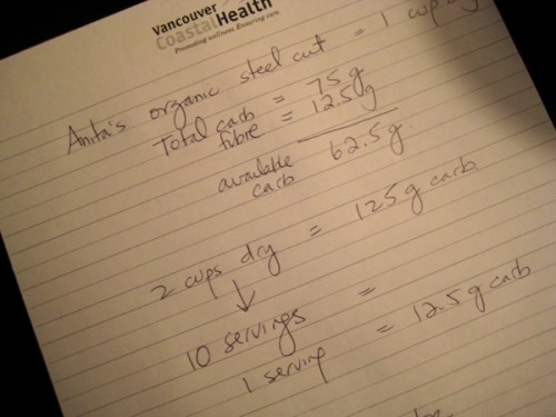So, instead of going to the appointment today looking for them to better my condition, I went looking to better work it with my training. The dietitian was awesome. We went through my usual meals, and she told me I was pretty bang on with my carb counts, except for my morning oats. I had been calculating them from a cooked portion, but it turns out, I should have actually been calculating them from the dry oats, something that was pretty near impossible for me given that I suck at math. But the dietitian called Anita’s Organics, which supplies my oats, and found out the nutritional values, then did this Sheldon-like equation based on the amount of dry oats I cook, and how many days the batch lasts me, and the fibre count, which equalled 12.5 grams of carbs per serving. I had been calculating 20 grams. No wonder I was having mid-morning lows!