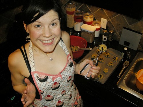 That’s me in my Sex and the City apron that I got for Christmas (so Charlotte!) with the cookie scooper I also got for Christmas, which after last night’s cookie baking ease has since become my current most favourite baking tool. Everyone should have one of these!