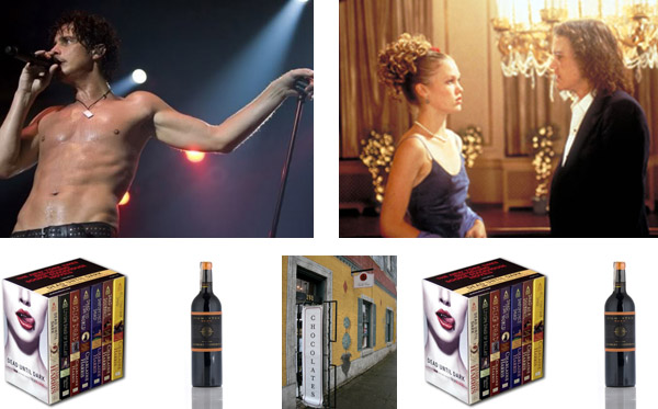 Yep, Chris Cornell was sitting at the breakfast table with me … well, by way of a ticket to his upcoming acoustic concert!!! And there was the Sookie Stackhouse books and Malbec wine (notice the orange) and the 10 Things I Hate About You blu ray and chocolates. Oh were there ever chocolates: milk chocolate, dark chocolate, lavender chocolate, almond and sea salt chocolate = yu-um! All things I do so very much love.
