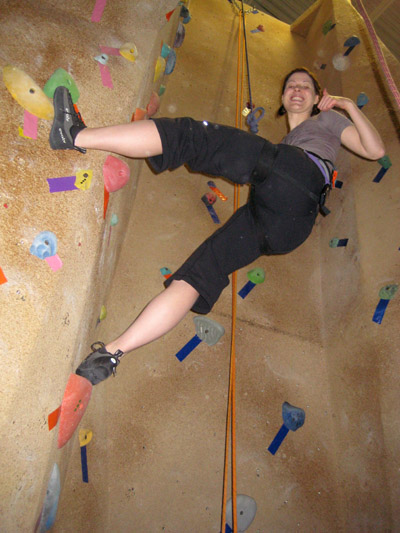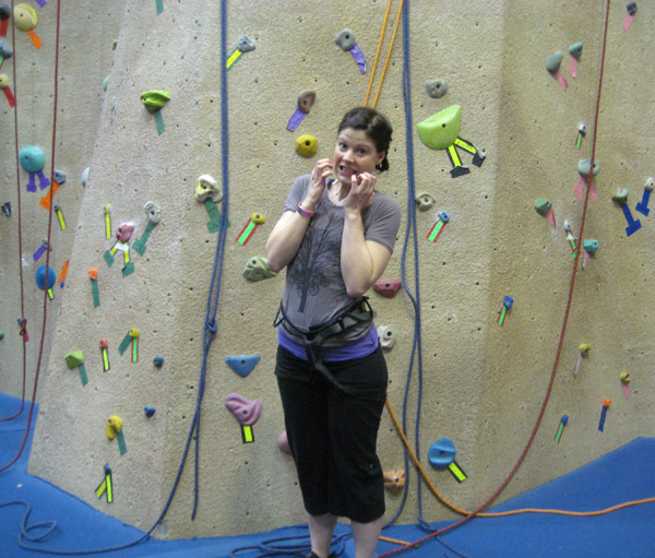 Oh my gosh, I cannot believe how much fun I had. I was climbing, and pulling myself up higher and higher, and using my limbs for leverage, and shimmying up against the wall, and getting stuck and then unstuck. And sure I was shaking to beat all hell to begin with and was somewhat untrustworthy of the dude holding my rope in place, and only twice did I let go of the ropes with both hands to rest for a bit, and only after much coercing from everyone down on the ground. But my gawd, it was great fun. I woke up this morning with bruises all over my knees and shins, and even a lump, and achy arms. It’s like war wounds! And when I climbed to the top of the “chimney” (oh yeah, I got the lingo) a narrow wall that was crazy hard in some spots, the sense of accomplishment I had touching the chain was like … butterflies ๐Ÿ˜€