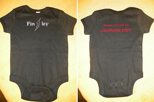 As you may recall, before Little Man Finley was born my brother and sister-in-law were having a heck of a time coming up with a name for Baby Number 3. Mario and I had a bit of a campaign going for them to name him Lightening Bolt … seemed logical, really. And just look what I had made for the little guy. Perfection.