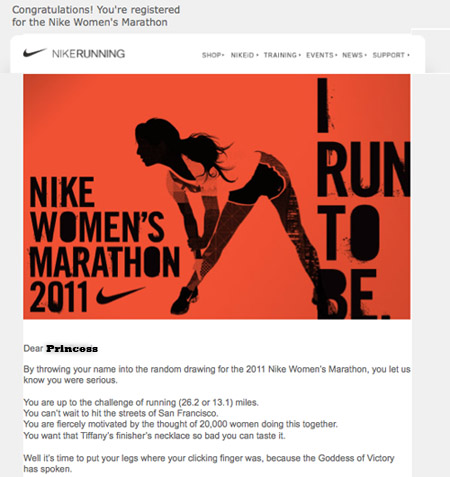 I’m in baby! The Nike Women’s Marathon (also known as the Tiffany’s Race) is one of the hardest races to get into, it’s so popular they have a lottery system in place, and this year, it had the most registrants for the lottery. I formed a team with my favourite chicks, but I wasn’t holding out too much hope, and I kept telling myself that I wouldn’t be overly heartbroken if we didn’t get in given that I’m going to be in San Francisco two weeks prior to this race for Mario’s gran fondo, and my wallet would probably love me more if I didn’t get accepted. But really, who was I kidding. This race is the race for me. Any race that ends with a Tiffany’s necklace – that’s right, a TIFFANY’S NECKLACE!!! – is worth being heartbroken over. Good thing I don’t have to be. Oh happy day!
