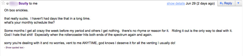 And you know, when I got her email and the question about the whole monthly thing (sorry guys) it dawned on me that yes, that could very well be the reason for that jackassedness, which in itself is really stupid because it doesn’t happen every month, just sometimes, when it feels like it. Awesome. But yeah, if any of my family would have suggested that, I would have vehemently shook my head thinking No, no, no, you can’t possibly know a thing about what I’m going through so no, no, no you can’t possibly be right. But Scully, she knows. Type 1s, they know. And having some of them in my corner, well, I don’t feel so alone anymore.