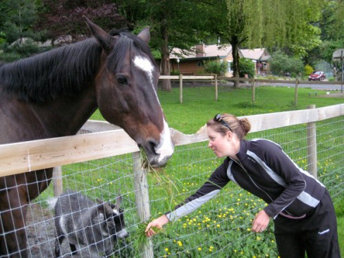 Feeding Mrs. Horse and her Billy Goat buddy along the trail.