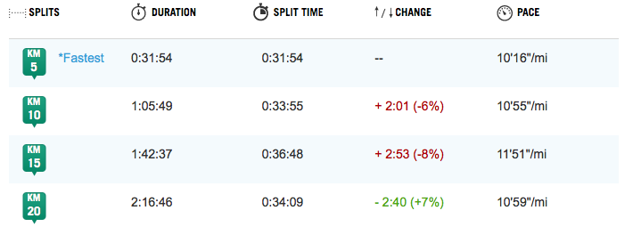 Can you imagine how difficult it was to try and race through that? (And yes, I did try!) My finish time was a walloping 23 minutes SLOWER than my fastest half marathon just five months ago, and I had close to an extra kilometre on my Garmin from all the weaving! Every split I had, was significantly slower than it should have been. My first 5 km was 5 minutes slower and my first 10 km was almost 10 minutes slower. Not cool.