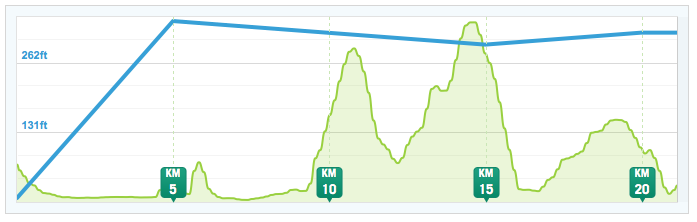 Speaking of hills, there were a lot! I tried counting, but lost count after like the sixth hill. There were big hills, long, winding hills, short, rolling hills, never-ending hills, hills, hills. At first I was doing great, running the entire length of them despite the walkers in front trying to circumvent my efforts. But by the time I reached the big hill at 14.5 km, I was feeling the evil nausea in my lungs and had started to hear the devil on my shoulder telling me to walk. I made it halfway up that hill, before caving in.