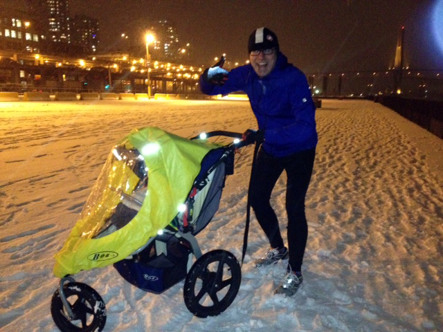 On Monday, Big Ring, Little Ring and I went for an evening run. It was Big Ring’s first run of the season; Little Ring’s first run ever; and my first run with a stroller… mind you, Big Ring took the reins on that front, so in this post we’ll focus on the snow.