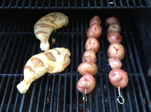 I didn’t have any flare ups, which apparently is a good thing, but I did burn the hell out of my cute oven mitts, I did sweat buckets in front of that face full of heat, and I did struggle like crazy trying to turn the shrimp and taters on those skewers. Seriously, impossible!