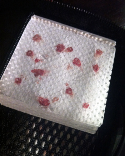 So. You know my fingers. My heavily callused fingers. My heavily callused fingers that became that way from decades of pricking them with a sharp needle. My heavily callused fingers that I squeeze blood from at least eight times a day. Have you ever wondered what I do with the excess blood lingering on those fingers following a blood test? Or, have you just assumed I use Kleenex or an alcohol swap or something else of that ilk. That would, after all, be the logical, un-gross thing to do right.
