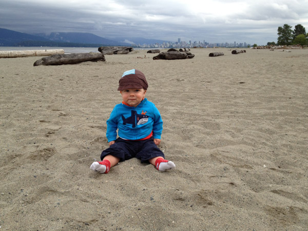 I was scheduled to run 7 km. Big Ring wanted to ride a bunch of kilometres. We also wanted a day together. What, oh what to do? We headed to UBC! The university district is a beautiful area to run, ride and eat. And so, after mapping out a route, Big Ring dropped me off just outside the university, and while I went for a run, he and Little Ring hung out on the sands at Spanish Banks.